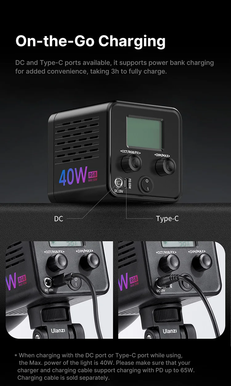 Tips:When charging with the DC port or Type-C port while using, the max power of the light is 40W. Please make sure that your charger and charging cable support charging with PD up to 65W.